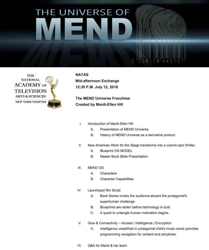 “Described as a multimedia experience / cross-media entertainment, MEND™ (“music encode decode”) is the unique concept of Mardi-Ellen Hill, award-winning writer, business consultant, an innovator in the world of business synergy and integration, and creator-inventor par excellence. A new global entertainment enterprise, MEND™ depicts the world of a psychological thriller for young audiences with an intergenerational hook, involving a family dynasty’s genetic secret hidden within a penetrating, specifically coded musical composition.